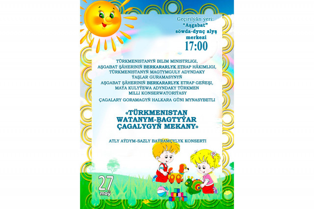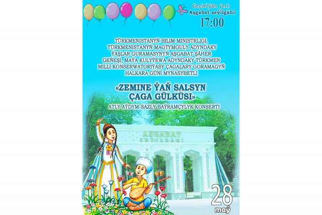 21.05.2024Hormatly Aşgabat şäheriniň ýaşaýjylary we Paýtagtymyzyň myhmanlary Sizi 28.05.2024 ýyly sagat 17:00-da geçiriljek Türkmenistanyň Bilim ministrligi, Türkmenistanyň Magtymguly adyndaky Ýaşlar guramasynyň Aşgabat şäher Geňeşi, Maýa Kulyýewa adyndaky Türkmen milli konserwatoriýasy bilen bilelikde taýýarlamagynda «AŞGABAT»