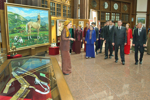25.04.2025«Halkara Parahatçylyk we ynanyşmak» ýylynda Türkmen bedewiniň milli baýramy mynasybetli Türkmenistanyň Şekillendiriş sungaty muzeýinde Aşgabat şäheriniň Berkararlyk etrap häkimligi, Türkmenistanyň Magtymguly adyndaky Ýaşlar guramasynyň Aşgabat