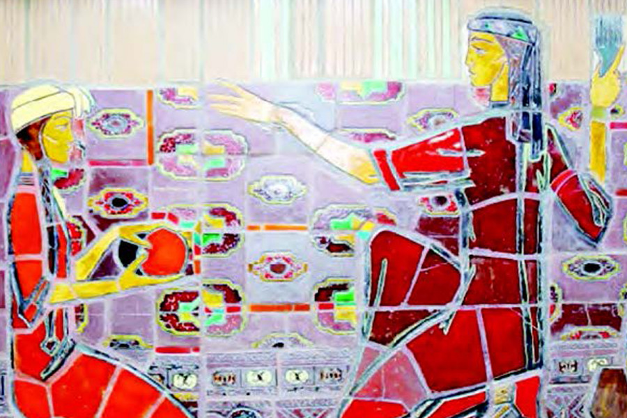 Alekseý Şetininiň 1973 — 1975- nji ýyllar aralygynda reňklenen şamotdan ýerine ýetiren «Ýaş halyçylar» heýkel toplumy reňkleriň bimöçber nepisligini öz içine alýar. Heýkeltaraş üç bölekden durýan bu eserinde nepis türkmen halysynyň üstünde iki sany ýaş, owadan halyçyny biri-birine bakyp oturan görnüşde şekillendiripdir. Ýaş gyzlaryň gapdalynda bolsa olaryň dokmada ulanýan ýüpleri ýerleşdirilipdir. Halyçylaryň köýneklerindäki goýy ýaşyl, gyrmyzy we gök reňkli syrçalar işiň dekoratiw bezegini amaly-haşam sungaty eserlerine ýakynlaşdyrýar. Elleri ýüpli halyçylar edil läle kakýan gyzlary ýady¬ňa salýar. Dokmaçylaryň ýüzi, täsin bakyşlary köň¬lü¬ňe rahatlyk berýär.