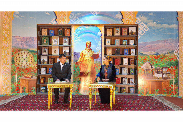 12.03.2025Türkmenistanyň Döwlet medeniýet merkeziniň Döwlet kitaphanasynda «Altyn asyr»:Türkmenistan teleýaýlymy bilen bilelikde «Kitap–dünýäniň açary» atly söhbetdeşlik geçirildi.