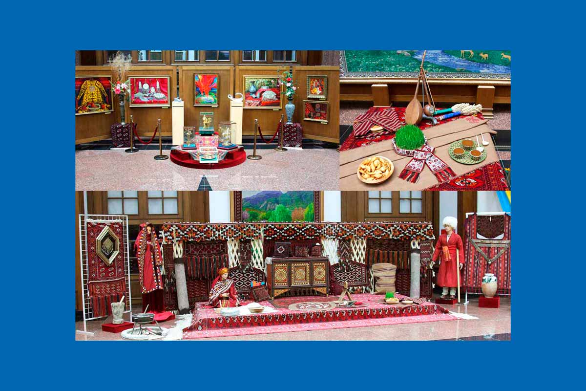 Ýurdymyzyň ähli künjeklerinde Milli bahar baýramy Halkara Nowruz güni mynasybetli Nowruz ýaýlasynda dürli aýdym-sazly dabaralar, folklory çykyşlar we milli oýunlar uly ruhubelentlik bilen ýaýbaňlanýar. Şonuň bilen bir hatarda Türkmenistanyň Döwlet medeniýet merkeziniň Döwlet muzeýinde milli bahar baýramy Halkara Nowruz güni mynasybetli «Gelse Nowruz äleme» atly sergi guraldy. Sergide muzeý gaznalarynda saklanylýan nusgalyk, gözelligi, ajaýyplygy, nepisligi bilen meşhur medeni gymmatlyklarymyz görkezildi. Ondan başga ussat suratkeşleriň türkmen tebigatynyň bahar paslyny wasp edýän surat eserleri, hünärmençiligiň ýokary çeperçilik derejesinde ýerine ýetirilen zergärçilik önümleri bolan bezeg şaýlary, nagyşlaryny tebigat gözelliklerinden alan keşdeler bilen bezelen milli egin-eşikleriň asyl nusgalary serginiň görnükli ýerinde orun aldy. Halk senetçiliginden türkmeniň milli saz gurallary bolan dutary we gyjagy, durmuş, öý hojalyk esbaplarynyň taryhy görnüşlerini synlamak bolsa sergä gelen myhmanlarda uly täsir galdyrdy. Türkmen sährasynyň gözel tebigatyny, ýaşyl reňke bürenip duran ýaýlasyny, gül-gülälekli meýdanyny, haýwanat dünýäsini janlandyrýan şekilli halylar sergide özboluşly sazlaşygy emele getirýär. Serginiň dowamynda haly we haly önümleri bilen bezelen tärimiň öňünde milli lybasly maneken gelniň el degirmeninde un üweýän pursatlarynyň hem-de Nowruz baýramynyň buşlukçysy bolan bugdaý maýsalarynyň, milli tagamlar pişmedir semeniniň goýulmagy baýramçylyk däpleriniň öwüşginini has-da artdyrdy.