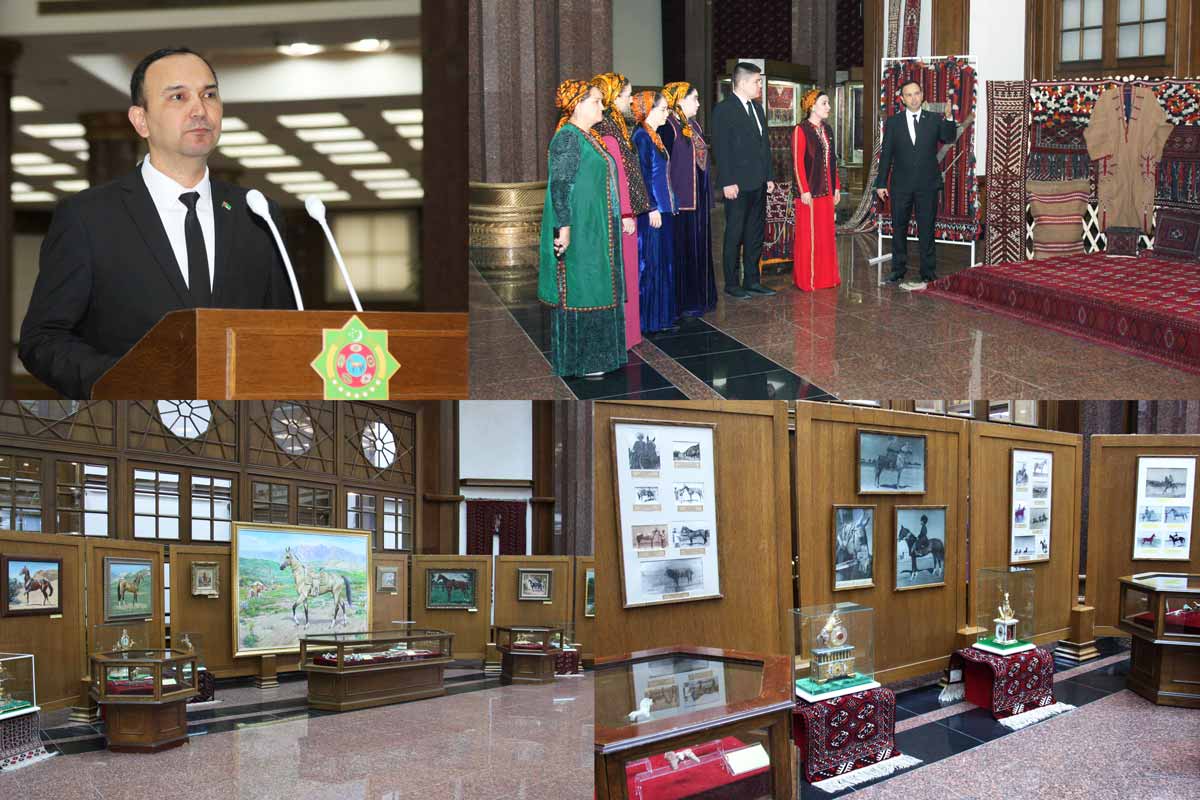 Türkmenistanyň Döwlet medeniýet merkeziniň Döwlet muzeýinde Türkmen bedewiniň milli baýramy mynasybetli "Behişdi bedewler – türkmen halkynyň şöhraty we buýsanjy" atly baýramçylyk sergisi gurnaldy. Sergide muzeý gaznalarynda saklanylýan bedew atlaryň milli bezeg şaýlary bilen bezelen fotosuratlary, tanymal suratkeşleriň ýerine ýetiren bedew atlary beýan edýän surat eserleri görkezilýär. Sergide arheologiýa tapyndylaryna degişli bolan bişen toýundan syrçalanyp ýasalan at heýkeljikleri hem görkezilýär. Ata-babalarymyz at üstüni şa tagtyndan eý görüpdirler, bedewini hormatlap, ony altyn-kümüş, haly önümleri bilen bezäpdirler. Serginiň görnükli ýerinde türkmen halkymyzyň milligini görkezýän “Ak öýüniň” içinde türkmen zenanlarynyň ussatlyk bilen dokan haly önümleri bolan dürli görnüşdäki torbalary, horjunlary, argaç çuwallary, ak öýüň bil ýüpleriniň görnüşlerini, at torbalaryny, erkek adamlaryň geýýän agarçäkmen, gyrmyzy donyny, halydan at basyryk, at ýapynjasyny, üsti eýerlikli atyň eýerlerini synlamak bolýar. Tärimiň iki gapdalynda gotazlar, şeýle hem, seçekler bilen bezelen at ýapynjanyň, haly eýerligiň, üstünde bezelip goýlan at şaýlary bolan boýunlygyň, göwüsbendiň, at gamçysynyň, uýan toplumynyň görnüşlerini görmek bolýar. Bu ýerde ussat zergärlermiziň döreden türkmeniň ahalteke bedewlerini wasp edýän, döwrüň bedew bady bilen ösüşlere barýandygyny alamatlandyrýan birnäçe zergärçilik eserlerini hem görmek bolýar. Serginiň dowamynda, türkmen bedewiniň keşbi halynyň çitimlerinde, nakgaşyň owadan reňklerinde, heýkeltaraşyň nepis sungatynda aýdyň beýanyny tapýar.
