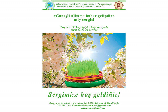 13.03.2025Türkmenistanyň Döwlet medeniýet merkeziniň Döwlet muzeýi 2025-nji ýylyň 14-nji martynda sagat 10:00-da Milli bahar baýramy mynasybetli «Täze günüň telwasy» atly gurnalan serginiň açylyş dabarasyna çagyrýar.