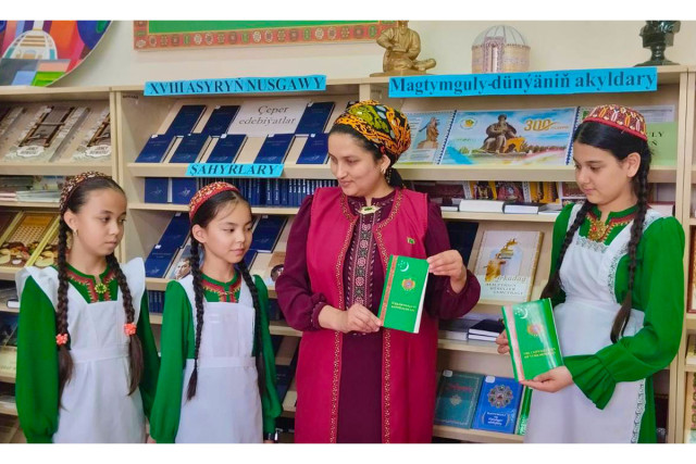 13.05.2025Türkmenistanyñ Bazar Amanow adyndaky döwlet çagalar kitaphanasy ýaňy-ýakynda Aşgabat şäheriniň ýöriteleşdirilen «Bagtyýar nesiller» adyndaky 74-nji orta mekdebinde ýurdumyzda Döwlet derejesinde bellenilýän Türkmenistanyň Konstitusiýasynyň we