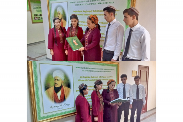 23.05.2024Aşgabat şäher medeniýet müdirliginiň Merkezleşdirilen kitaphanalar ulgamynyň Magtymguly adyndaky merkezi kitaphanasynyň guramagynda Aşgabat şäherindäki Mehaniki tehnologiki orta hünär okuw mekdebinde Magtymguly Pyragynyň doglan gününiň 300 ýyllygy mynasybetli «Şan – şöhraty dünýä dolan Pyragy» ady bilen gürrüňdeşlik geçirildi.