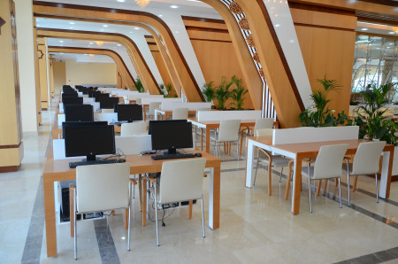Kitaphanada 10 sany ýöriteleşdirilen bölüm hereket edýär. Kitaphananyň täze binasynyň umumy tutýan meýdany 12 müň 150 inedördül metr. Binanyň beýikligi 45 metr, ini 50 metr, gapdal uzynlygy 115 metr. Kitaphana 6, ýerzemin gaty bilen 7 gatdan ybarat. Kitaphanada 1 million neşir birligini saklamak hem-de birbada 360 okyja hyzmat etmek üçin ähli mümkinçilikleri döredilen, kitaphanada 6 sany umumy okalga zallary bar. Kitaphananyň esasy baýlygy bolan neşir önümlerini degişli derejede saklamak üçin niýetlenilen häzirki zaman talaplara laýyk gelýän uly gaznahana, häzirki zaman tehniki enjamlar oturdylan rejeleýiş we dikeldiş bölümi üçin niýetlenilen aýratyn iş otaglary bar. Kitaphana hyzmatyny guramak hem-de kitaphananyň ýörite bölümleriniň işini talaba laýyk ýola goýmak üçin ähli mümkinçilikler göz öňünde tutulan.